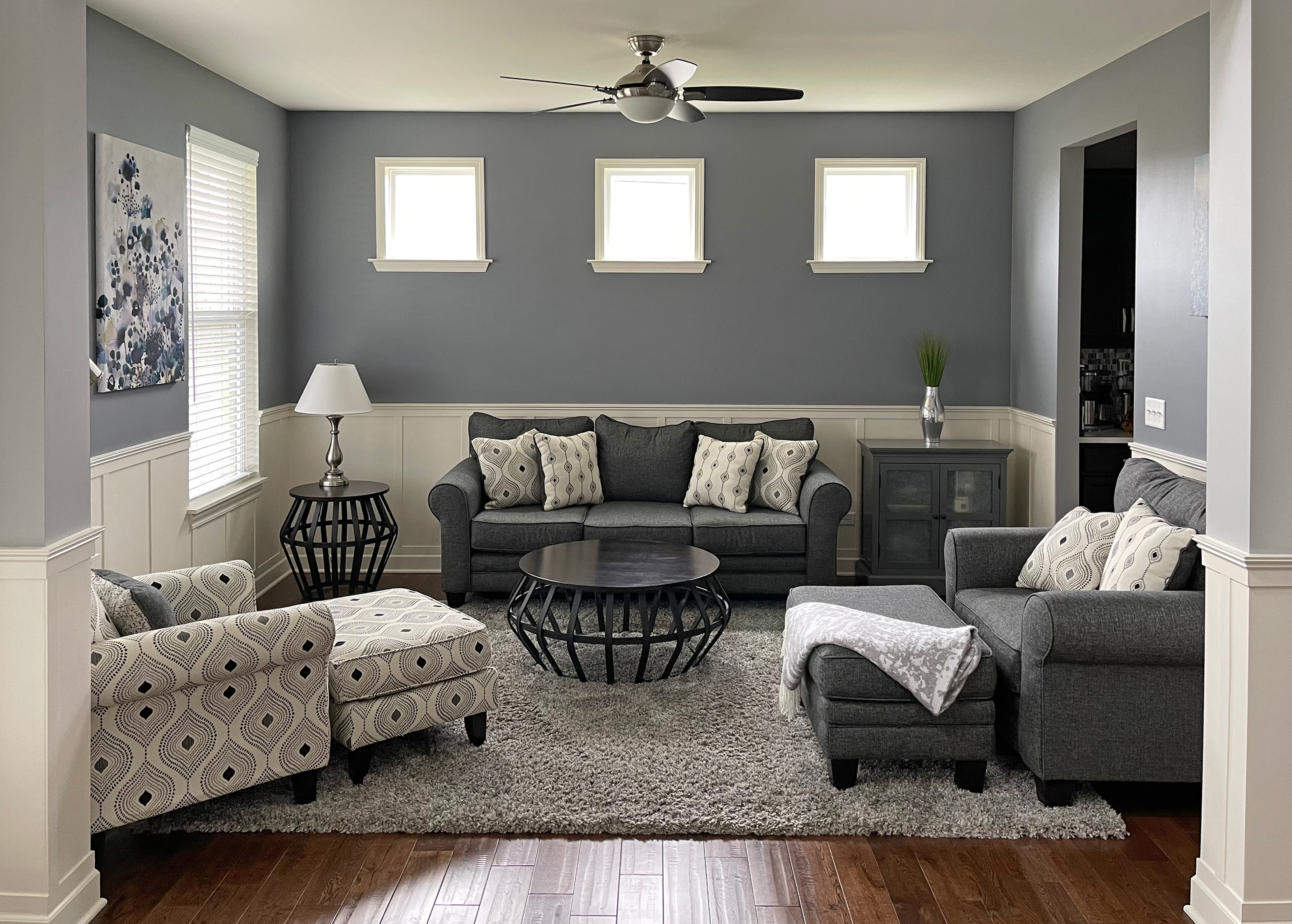 Hand scraped solid oak flooring, artwork, painting, trim work, ceiling fan, furniture, lighting & various decor.