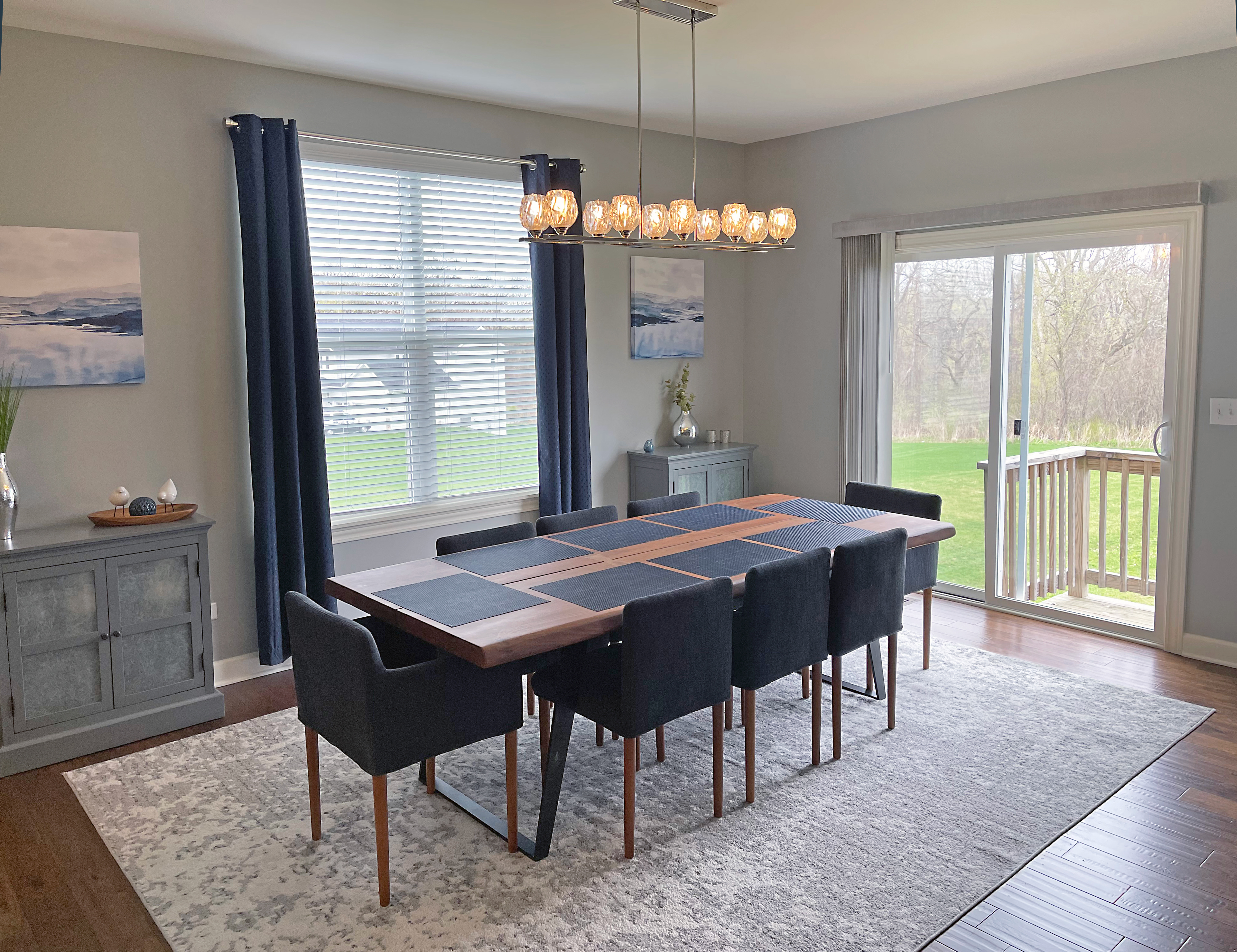Hand scraped solid oak flooring, lighting, rug, artwork, curtains, table, chairs, place mats and misc decor.
