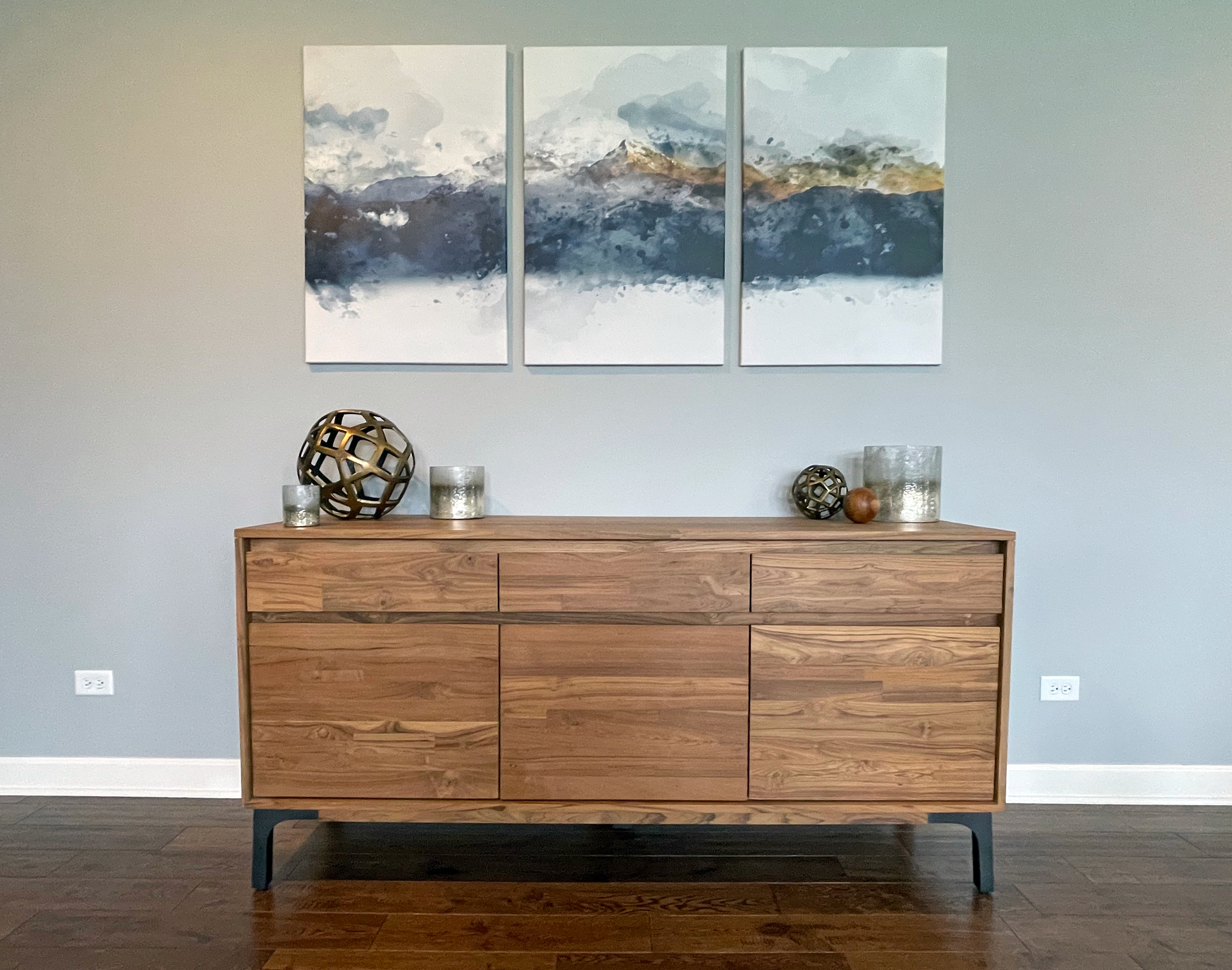 Hand scraped solid oak flooring, teak sideboard, artwork, and various decor.