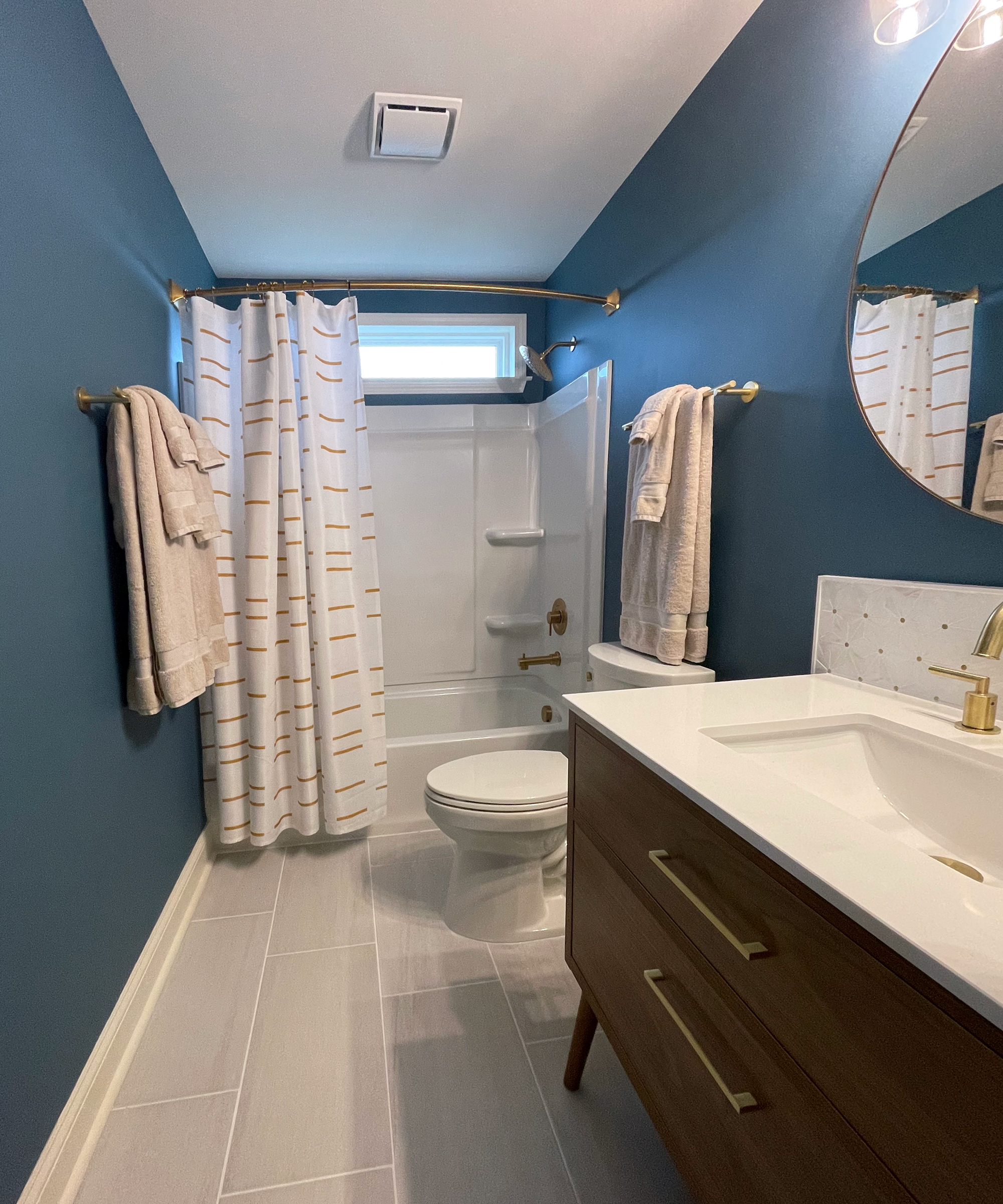 Tile, trim work, vanity, mirror, lighting, toilet, paint, faucets, curtain rod, curtain, towels and exhaust fan.